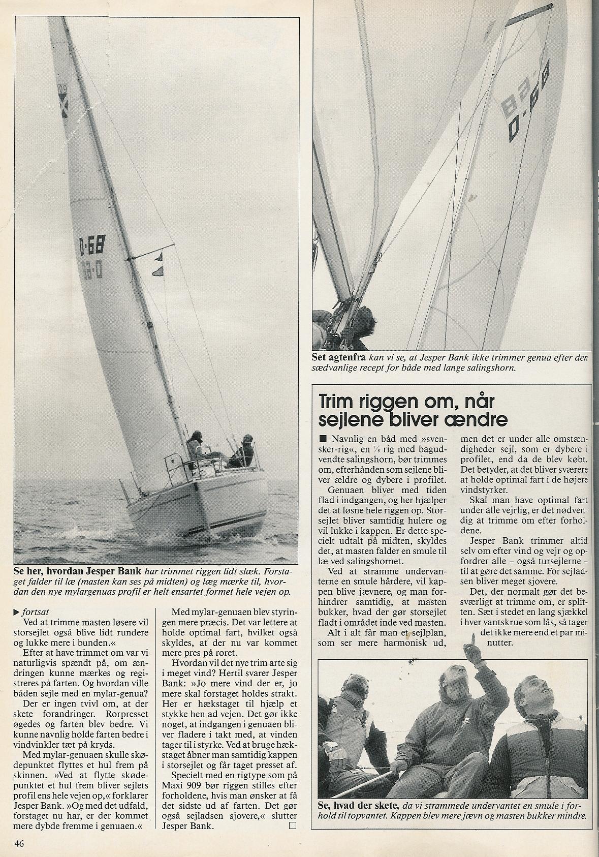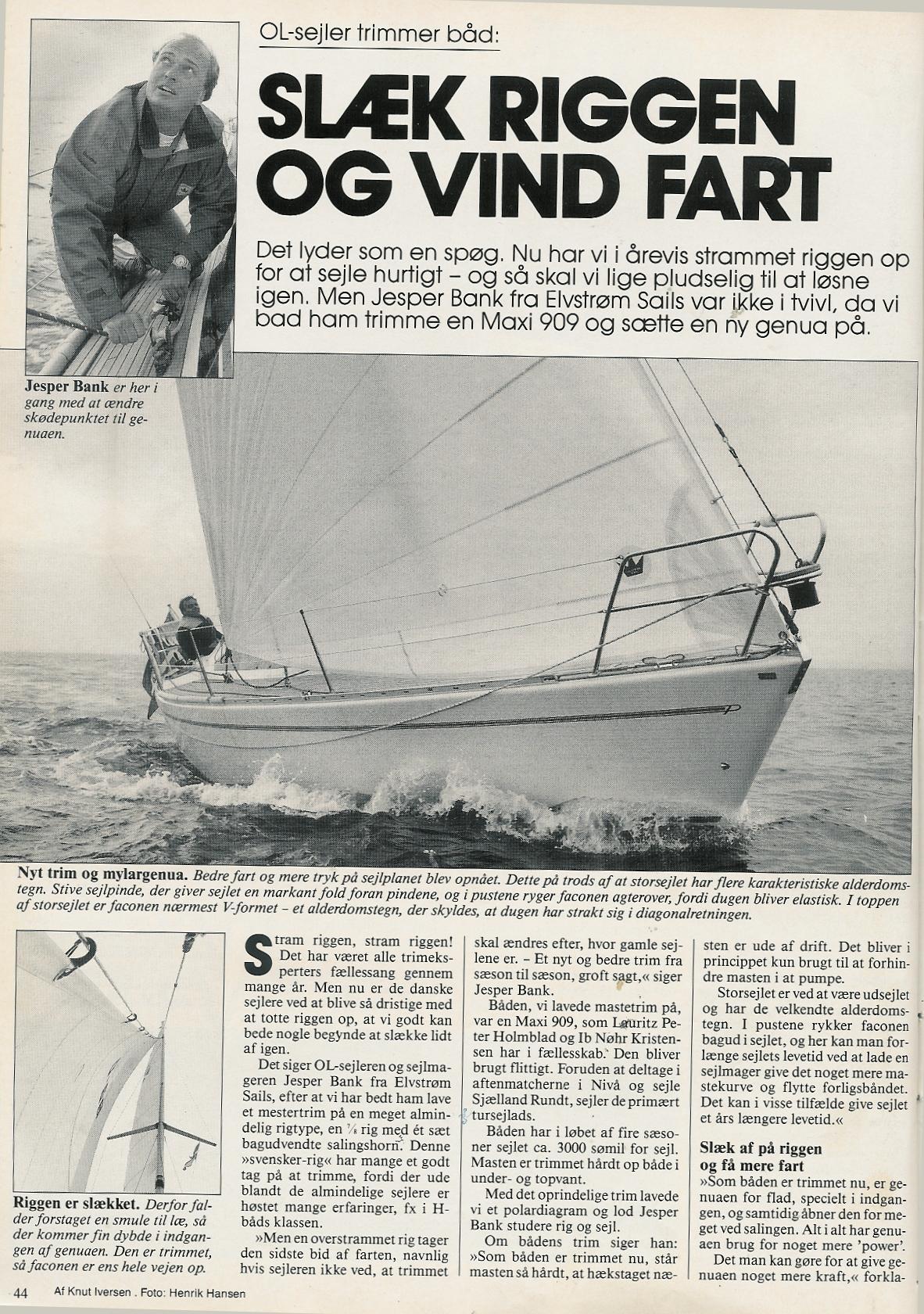 Bådnyt bad i 1991 Jesper Bank give hans bud på hvorledes man får en 7/8-dels rig med bagudvendte sallinger i "mestertrim". Turen foregik i en Maxi 909.