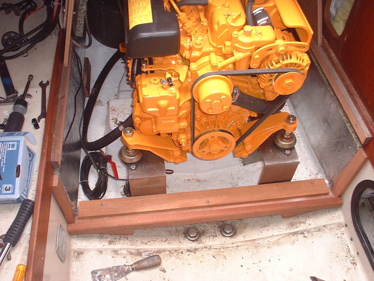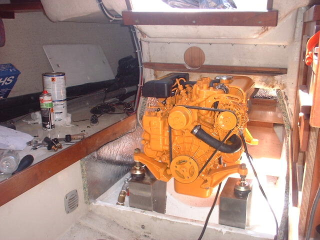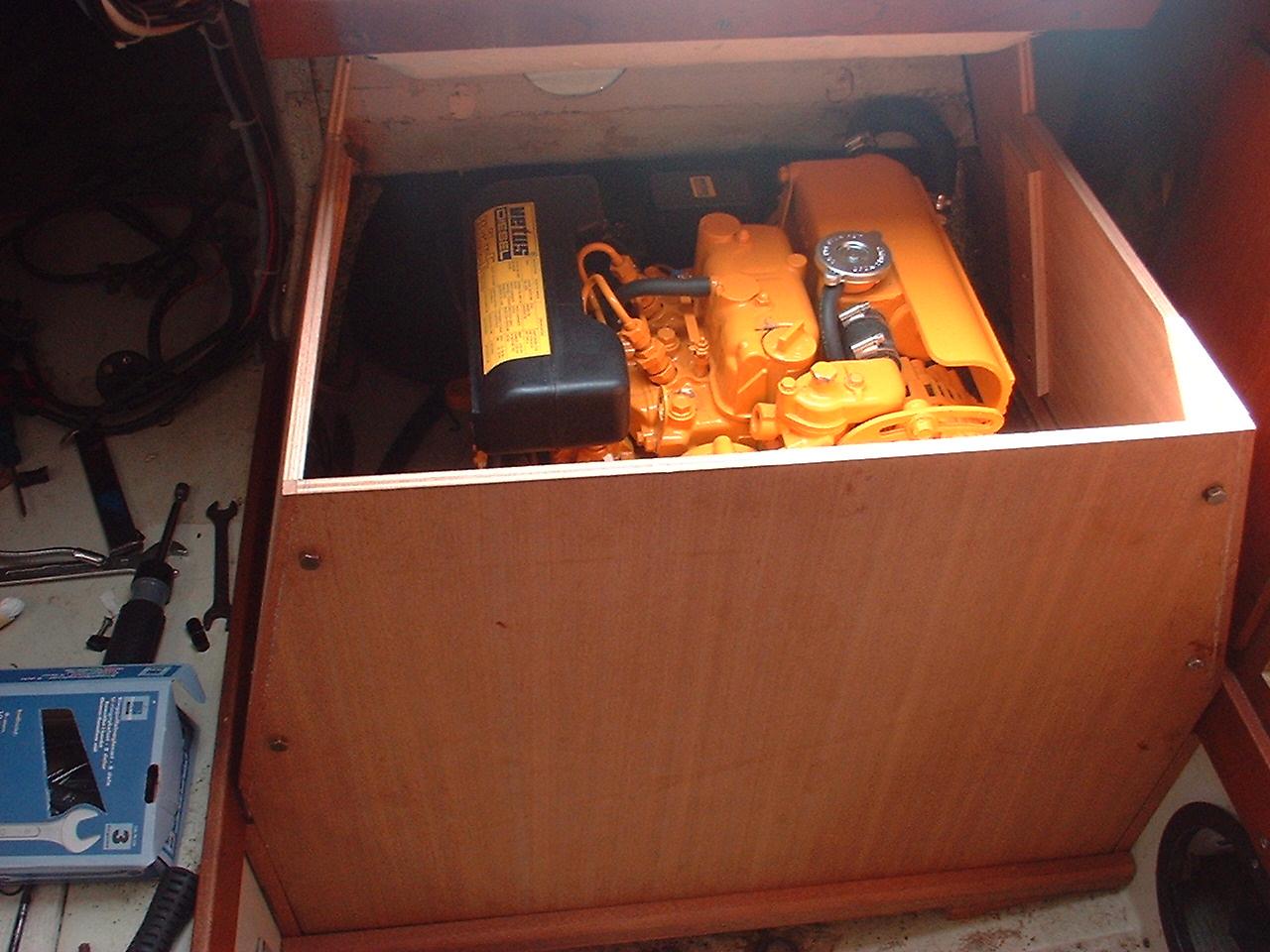 Vetusen er ganske vist lettere og lavere end volvoen, men pga de to cylindre er den ca. 10-12 cm. længere, samtidig med at den står højere på benene. Derfor kommer i alt ca. 5cm ovenud af motorkassen i højden, samt 5-6 cm ud af motorkassens frontplade ind i kahytten. Resultat - byg en ny motorkasse ! pas godt på katten ikke render med målene, for skufferne i pantryet kan lige nøjagtig åbnes efter montering af den lidt større motorkasse.