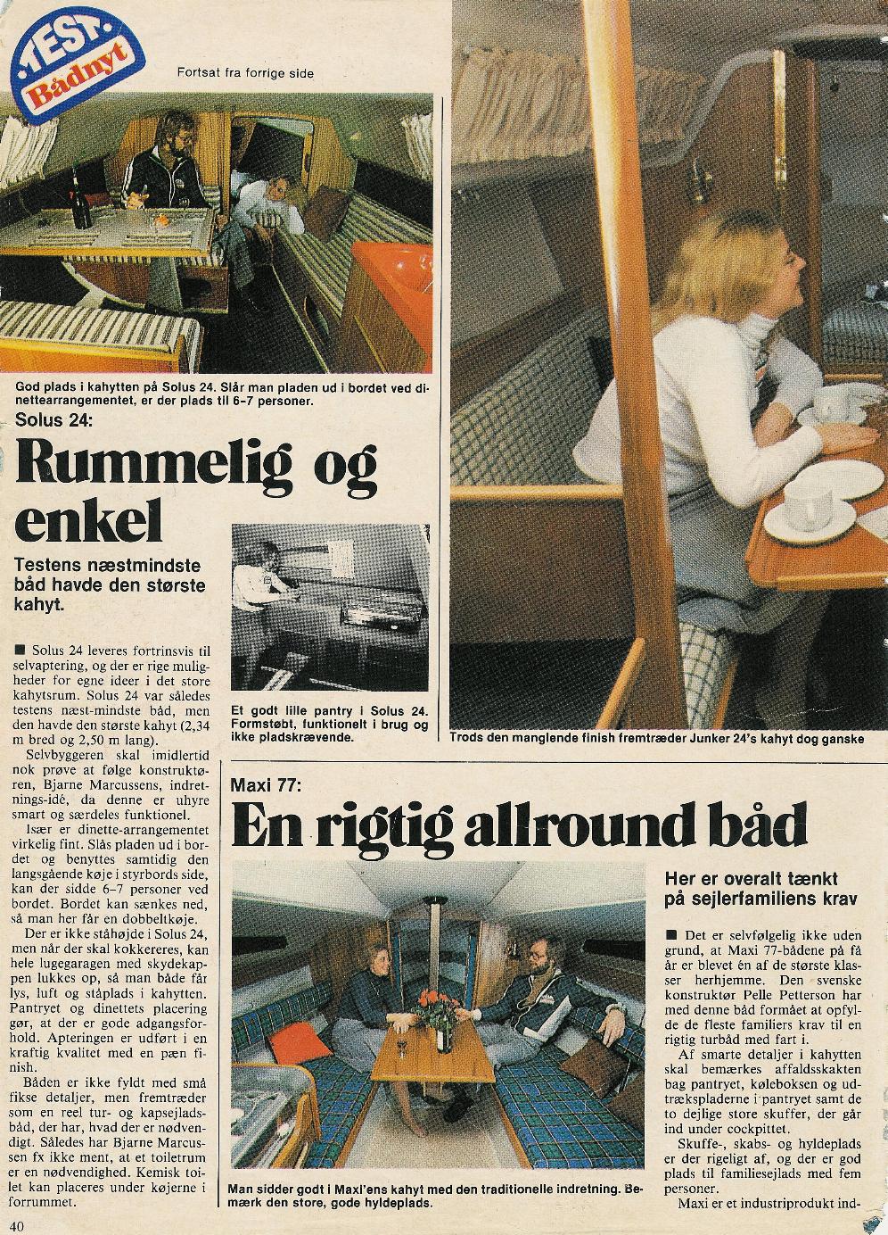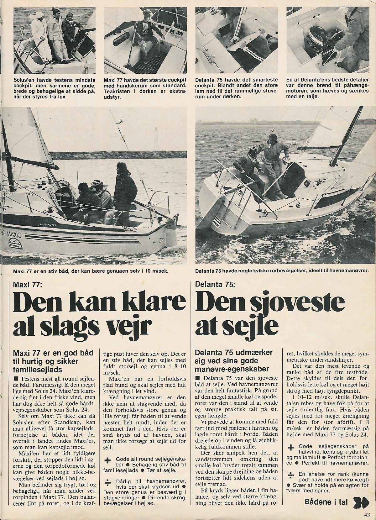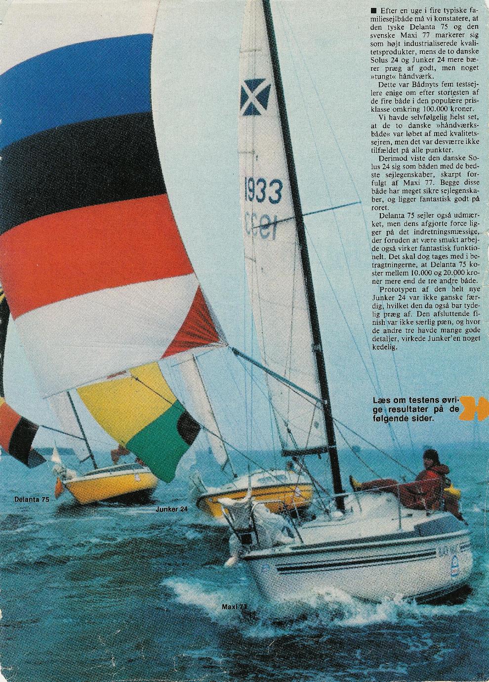 Bådnyt bragte i 1979 en 6 sides artikel der beskrev 4 familiebåde i den populære prisklasse. Testen inkluderede selvfølgelig maxi 77.