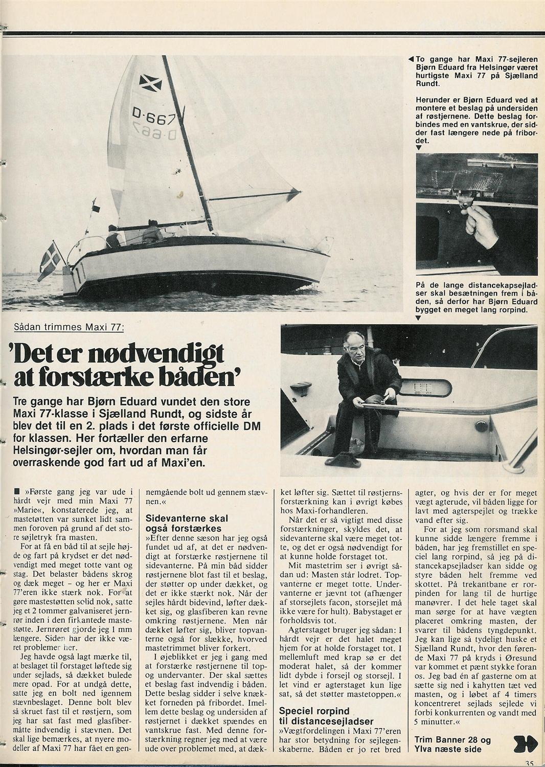 Bådnyt bragte i 1983 en artikel, der beskrev hvorledes nogle bådtyper skulle trimmes. Heriblandt maxi 77.MAXImalt sparer dig hermed for turen på biblioteket.