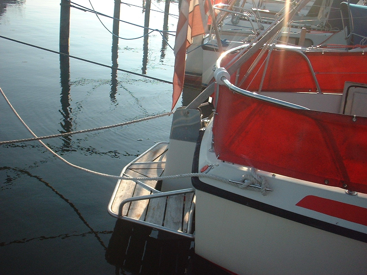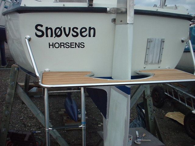 Nu har jeg jo tidligere skrevet lidt om en badeplatform til en maxi 77ér, så nu syntes jeg lige jeg vil sende et billede af resultatet. Desværre tror jeg at den er monteret ca. 10cm for lavt, så badestigen rører vandet når jeg sejler for motor. Det skal undersøges nærmere når jeg har fået rigget båden færdig. Det må jeg så ændre til vinter når "snøvsen" igen er på land.