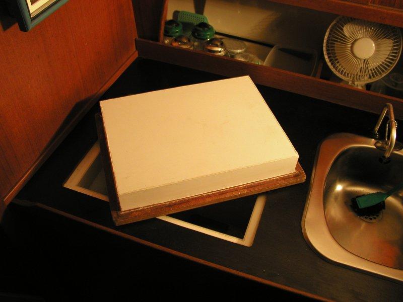 • Under den rustfrie beklædning på låget til køleboksen var min isoleret med en klods af skum ”Flamingo”.