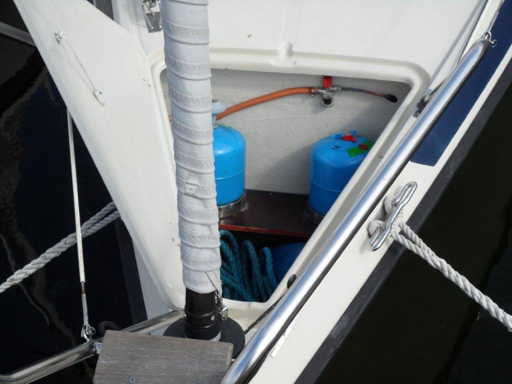 Vi har placeret gasflaskerne og læktester i ankerbrønden. Et langt ubrudt kobberrør fører frem til gasapparatet.