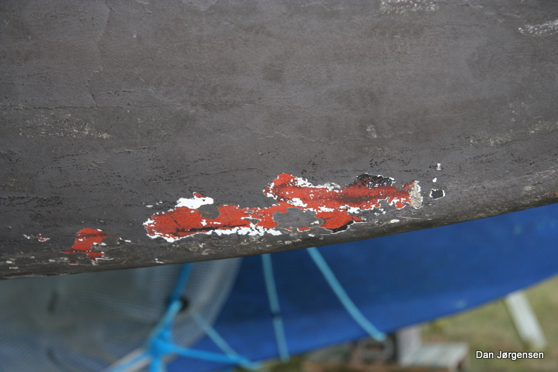 Et par steder ved stævnen er bundmalingen også røget helt af og man kan se en hvid/rød farve under den. Det fremstår med en pæn tør overflade og jeg kan ikke se nogle bobler der kan presses hul på så der kommer eddikelugtende vand ud af dem.