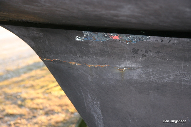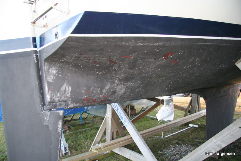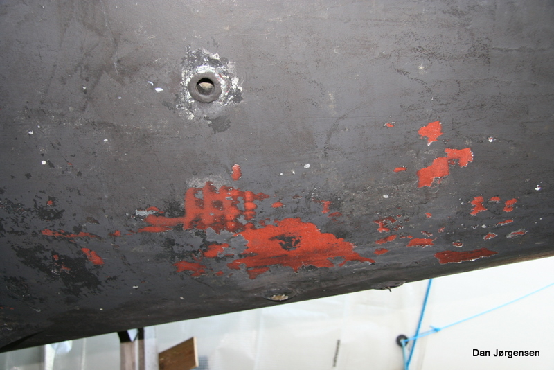 Da den kom op i efteråret var der en del begroning (ruhr og alger) på solsiden agter, men ikke noget særligt ud over det. Efter en højtryksspuling blev den pæn og ren, men nogle enkelte steder gik bundmalingen helt af og man kan set ”det der er under bundmalingen”.
